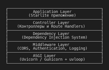 raise NotFoundException(detail="Item not found")Преимущество Starlite: специализированные классы исключений для каждого HTTP-статуса.